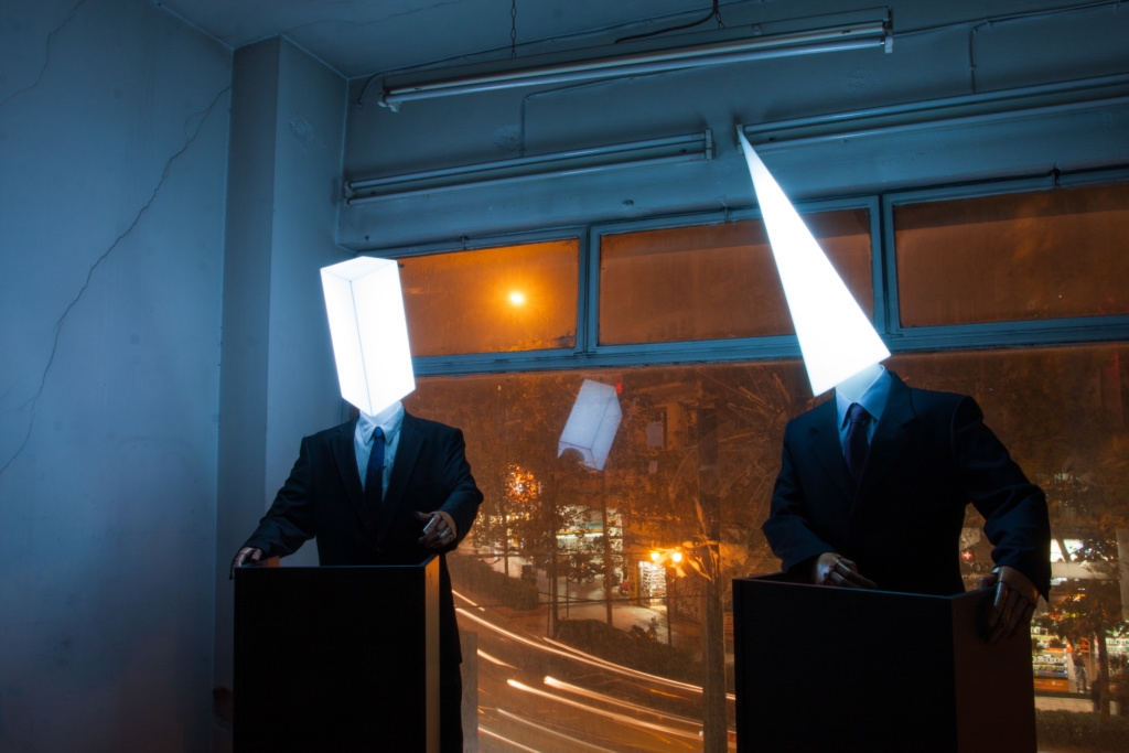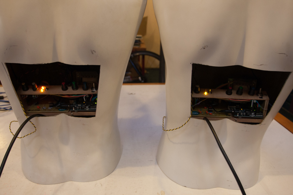 Each character is an autonomous and independent unit. Through the use of custom electronics, an Arduino micro-controller and programming, each spokesman waits for a short moment of silence to resume speaking. The act never reaches a conclusions and it is performed in a non-deterministic way. The logic was prototyped in Processing. Custom PCB design for the audio filter by Mihalis Marinis.